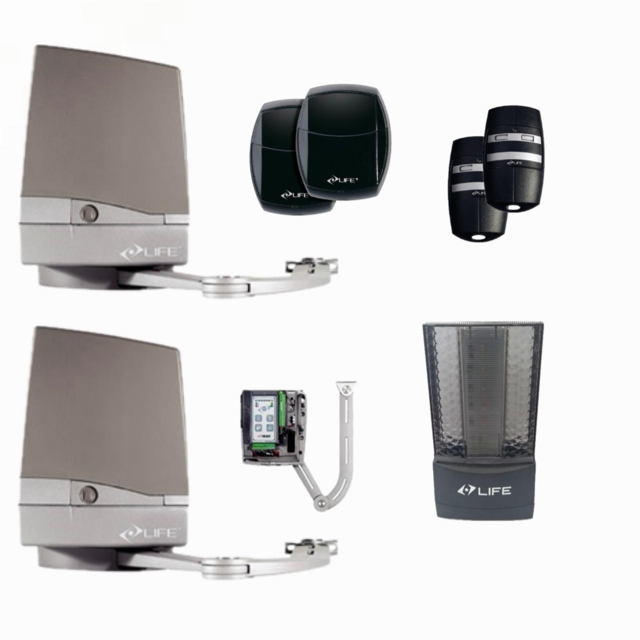 Sada pákových pohonů LIFE ARMOR UNI DL 042 je určena pro dvoukřídlé brány s maximální délkou křídla 2,3 m a hmotností každého křídla do 250 kg. Součástí balení jsou dva pohony, řídící jednotka RGUNIR DL, dva dálkové ovladače FIDO2, signalizační maják SUN-LED a pár infrazávor VISIO. Napájení je standardní 230 V, 50 Hz. Sada je vhodná jak pro domácí, tak i komerční využití. Pro optimální funkci se doporučuje úhel otevření mezi 30 a 120°.