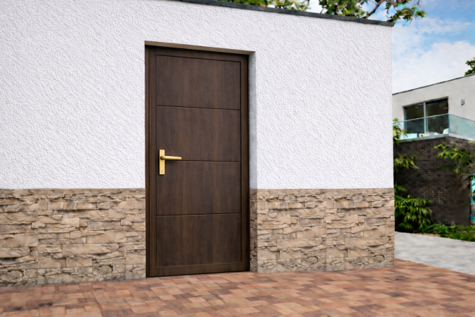 Dveře mají hladký panelový povrch a pevný rám lakovaný ve stejné barvě jako křídlo dveří. Spodní část je vybavena prahovým profilem 40 × 40 mm, který zvyšuje pevnost konstrukce. Otevírání dveří je řešeno směrem ven.